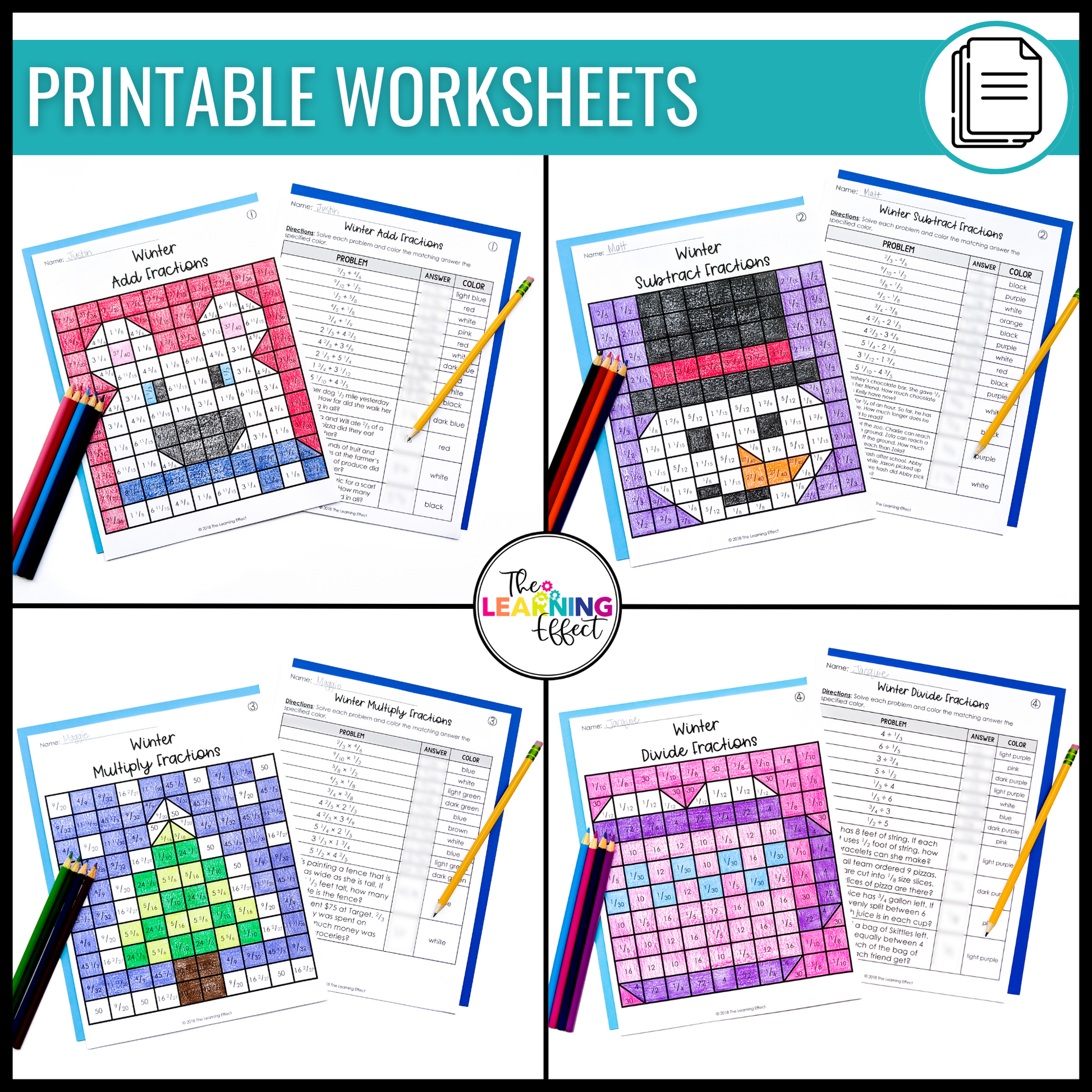 - Printable activities with fraction problems and color by number sheets.